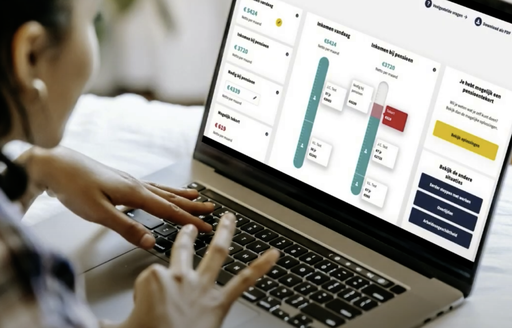 Door slimme koppelingen met verschillende databronnen waaronder DigiD, bespaar je de klant en adviseur veel tijd. Hierdoor kan de adviseur gelijk starten met waar het echt om gaat. Namelijk: het inzichtelijk maken van de financiële situatie van de klant, en advies geven hoe bij pensioen, arbeidsongeschiktheid of overlijden van een partner de financiële situatie verbeterd kan worden.